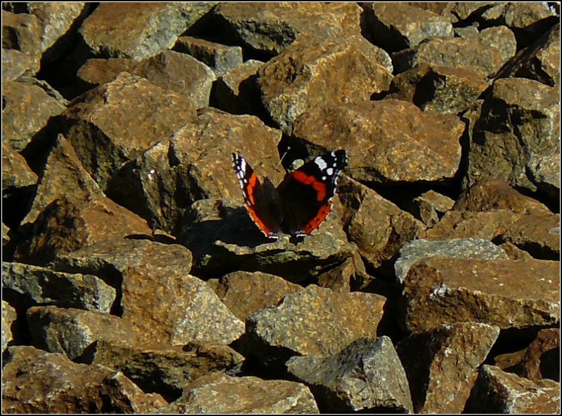Ein Admiral (Vanessa atalanta) auf Abwegen. Was der da wohl suchen mag?